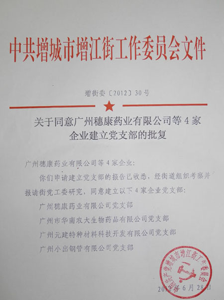 增江街黨工委相關領導在2012年7月2日蒞臨我司進行揭牌儀式,宣告廣州市華南農大生物藥品有限公司黨支部正式成立。