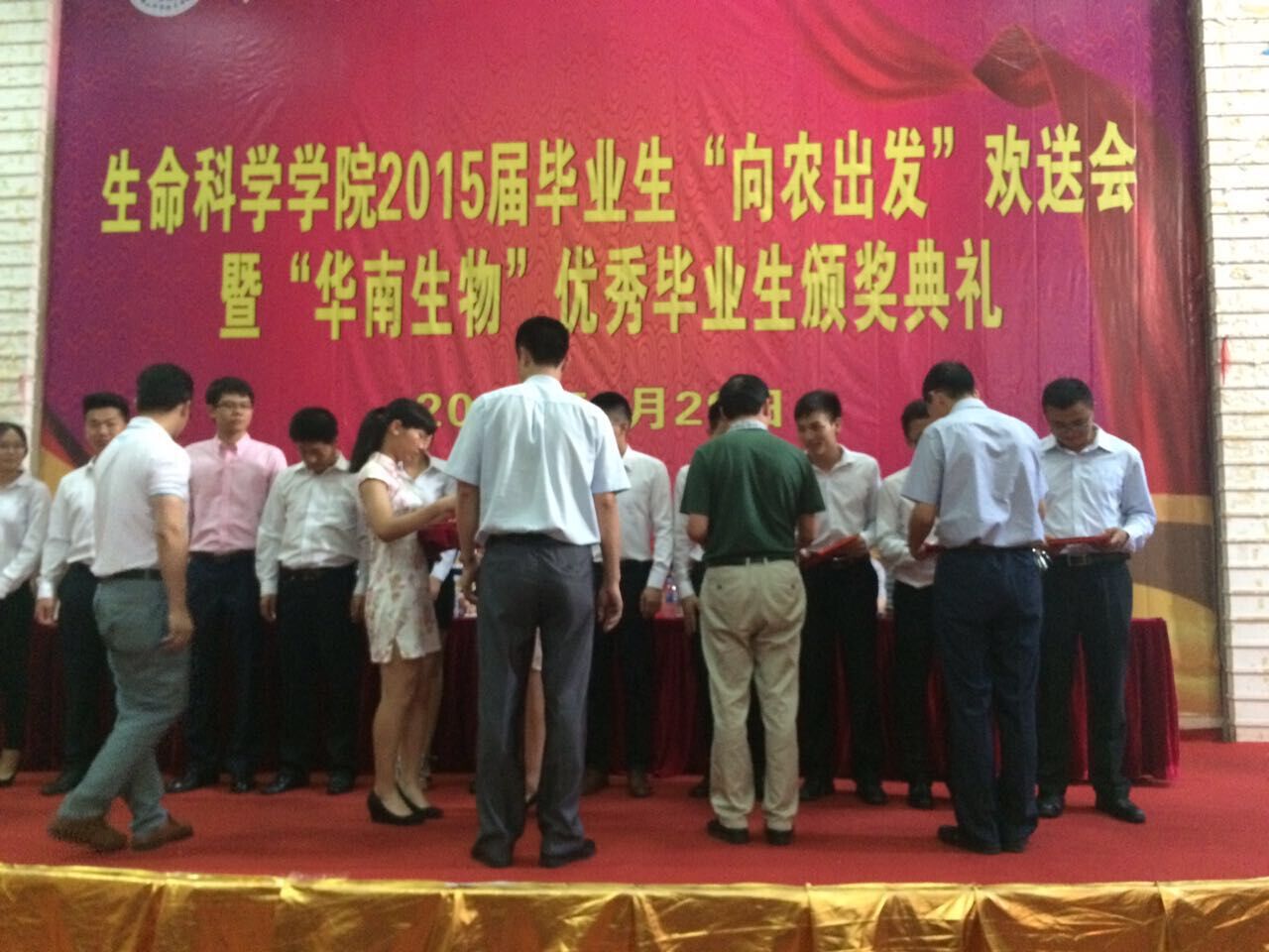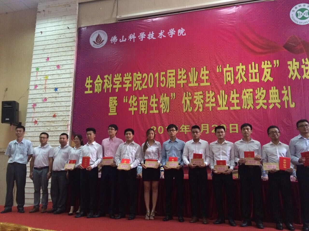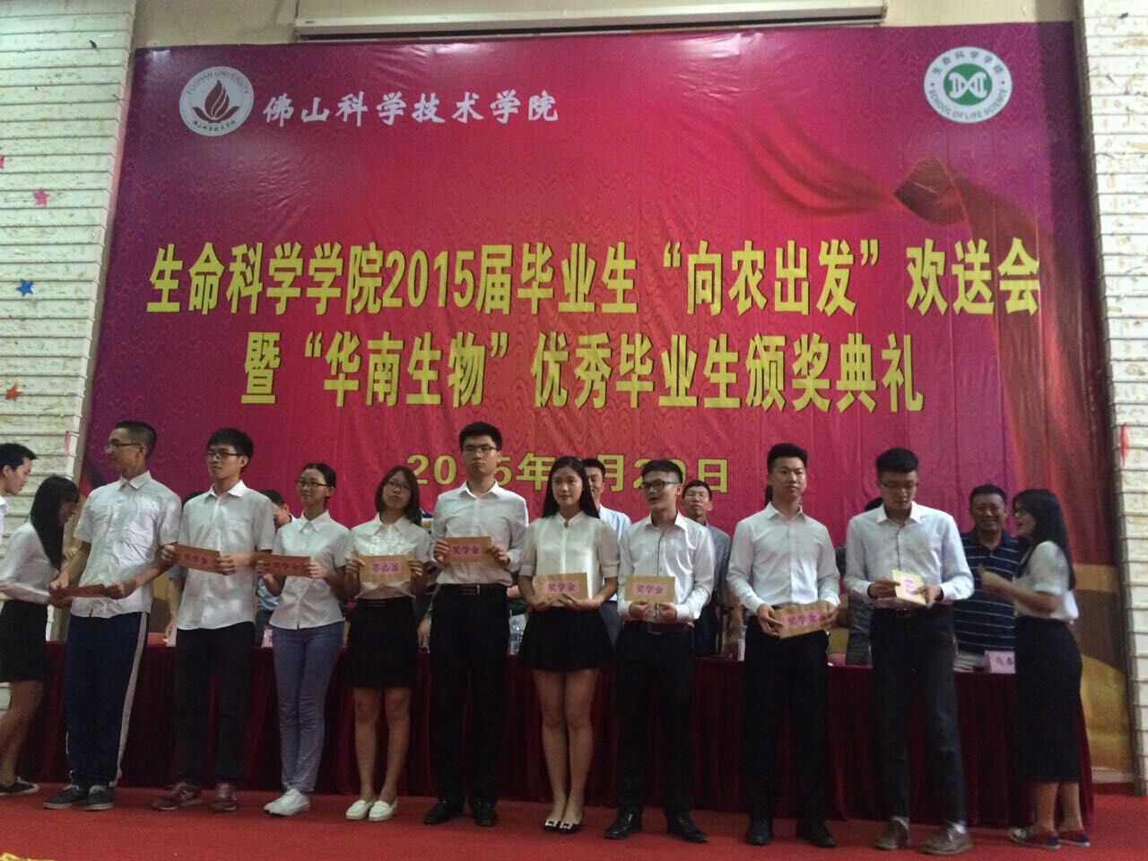 2015年6月29日下午佛山科學(xué)技術(shù)學(xué)院生命科學(xué)學(xué)院2015屆畢業(yè)生“向農(nóng)出發(fā)”歡送會(huì)暨“華南生物”優(yōu)秀畢業(yè)生頒獎(jiǎng)典禮在北院圖書館一樓報(bào)告廳舉行。佛山科學(xué)技術(shù)學(xué)院生命科學(xué)學(xué)院院長(zhǎng)王炳云、書記甘蔭全等學(xué)院領(lǐng)導(dǎo)、廣州市華南農(nóng)大生物藥品有限公司副總經(jīng)理黃國(guó)城、班主任、嘉賓、全體畢業(yè)生出席并參加了畢業(yè)生頒獎(jiǎng)典禮。