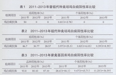 2011~2013年曾祖代、祖代種禽場和地方品系雞雞白痢陽性率進行比較(見表1、2、3)可見,曾祖代種禽場除了2011年檢測陽性率較高外,2012~2013年檢測結果都比較好,陽性率為0;祖代種雞場持續保持雞白痢抗體陽性,但整體陽性率處于降低的水平,局部雞場可能出現了反彈;家禽基因庫雞白痢抗體陽性率保持在很高的水平。雞白痢抗體陽性率整體處于下降水平,但是在這些種雞群中存在ALV、REV等不同病原的兩重或多重感染。