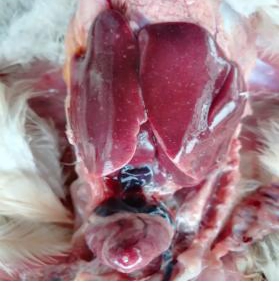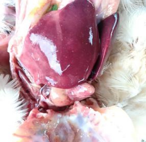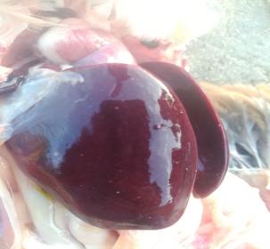 本場爆發的雞霍亂病例中多為急性病例,雞群并未見明顯的臨床癥狀,多數雞突然死亡。少部分雞精神倦怠、離群呆立,少見甩頭癥狀。病雞排黃綠色稀糞,呼吸加快。體重較大的雞死亡率較高,剖檢可見鼻腔有泡沫狀粘液,雞冠蒼白水腫;氣管有卡他性滲。心臟脂肪和外膜出血,肝臟有明顯的白色壞死點;十二指腸粘膜紅腫。肝臟病變見下圖: