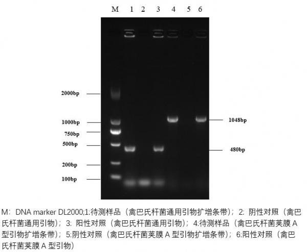用莢膜分型引物進行PCR擴增,結果顯示為A型多殺巴氏桿菌陽性。凝膠圖片如下:
