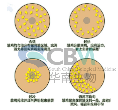 在實(shí)際飼養(yǎng)過(guò)程中。要根據(jù)情況看雞施溫。判定溫度是否適宜還要取決于雞群狀態(tài)。在正確的溫度下雞群散開(kāi),雛雞一般20—30只為一個(gè)群體,且不同群體間的雛雞相互運(yùn)動(dòng),叫聲清脆。溫度過(guò)高,雛雞沒(méi)有叫聲,張口喘氣,頭和翅膀下垂,遠(yuǎn)離熱源。溫度過(guò)低,雛雞在靠近熱源處扎堆,發(fā)生悲鳴的叫聲。賊風(fēng)、光照不均、外界噪音也會(huì)引起扎堆情況,要認(rèn)真觀察,加以區(qū)分。