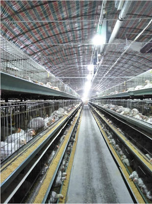 根據(jù)飼養(yǎng)規(guī)模要配套安裝照明設(shè)備,要注意照明線路的安全可靠。以單組雞計(jì)算,需燈10盞。燈泡高度離地面2.1—2.4米,燈距3—3.5米,需交叉兩排。燈泡到墻的間距為燈泡間距的一半(即1.5—1.75米)