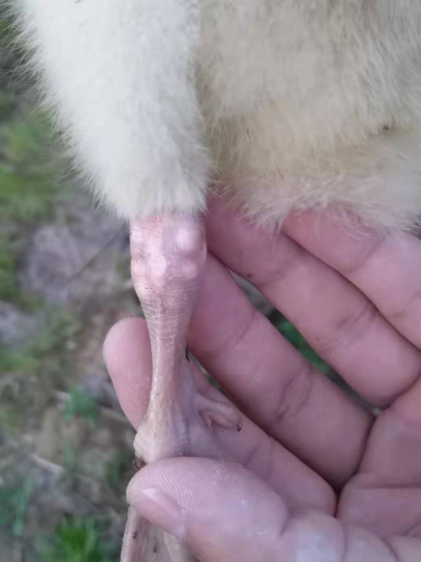 3、發(fā)病后期:表現(xiàn)站立不穩(wěn),喜臥,受驚嚇時(shí)也不能行走,雙側(cè)附關(guān)節(jié)明顯紅腫,喙發(fā)紅,體溫升高,脫水。附關(guān)節(jié)手感發(fā)燙,觸碰時(shí)雛鵝有疼痛感。大群拉水樣稀便。