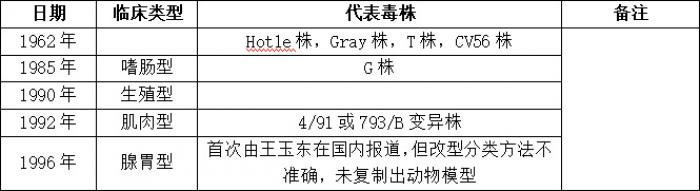 雞傳染性支氣管炎是一種廣泛存在的對家禽業(yè)造成巨大經濟影響的家禽疾病。不斷出現的新的IBV基因型及不同基因型之間缺少交叉保護已經成為防控IBV的重要挑戰(zhàn)。IBV致病型(臨床型)與IBV毒株血清型/基因型之間并無必然的聯(lián)系,不同血清型或基因型毒株可能屬于相同致病型。同時,屬于同一血清型或基因型的IBV毒株可能屬于不同致病型。現就雞傳染性支氣管炎病毒臨床分型和代表毒株說明如下: